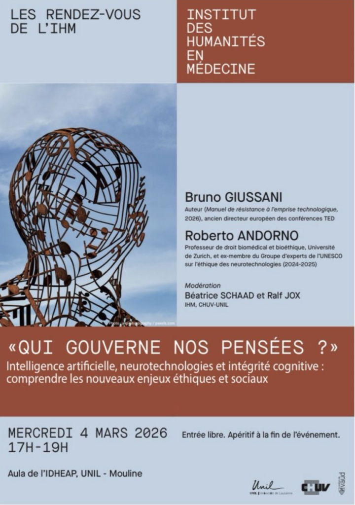 Le Centre Hospitalier Universitaire Vaudois (CHUV) à Lausanne, membre de l’Alliance sans frontières pour le partenariat de soin avec les patients organise avec la faculté de médecine de l’Université de Lausanne et l’institut des humanités en médecine (IHM)un rendez vous sur le thème qui gouverne nos pensées à l’ère de l’intelligence Artificielle (IA), le 4 mars 2026