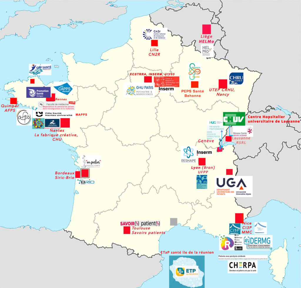 - de localiser grâce à une cartographie, des patients, aidants partenaires, usagers et professionnels en santé qui s’intéresse et souhaitent s’impliquer dans le partenariat en santé