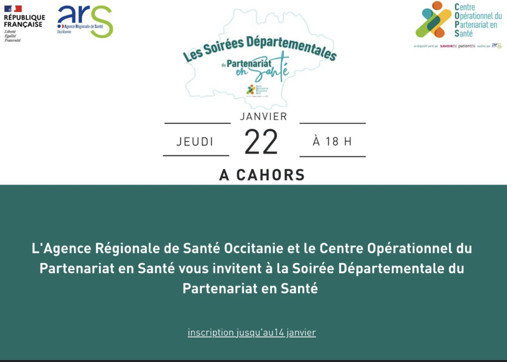 Le Centre Opérationnel du Partenariat en Santé (COPS) issue du partenariat entre l’ARS Occitanie et l’association membre fondatrice de l’Alliance pour le partenariat de soin avec les patients » savoirs patients » co-organise le 22 janvier, avec la Délégation Départementale 46 de l’Agence Régionale de Santé Occitanie, une : Soirée exceptionnelle dédiée au Partenariat en Santé
