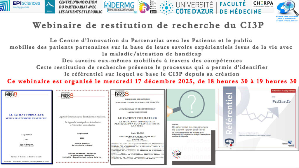 Dans la série des restitutions de résultats de recherche menées avec le CI3P, le mercredi 17 décembre 2025, de 18 heures 30 à 19 heures 30 sera présenté le processus de recherche qui a permis de concevoir ce référentiel de compétences de patient partenaire comme base méthodologique d’action de ces différentes organisations depuis une quinzaine d’année.