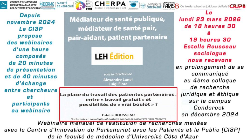 Un webinaire mensuel de restitution de recherches menées avec le CI3P sur la place du travail des patientes partenaires, entre travail gratuit et possibilités de vrais boulot sera présentée par Estelle Rousseau sociologue.